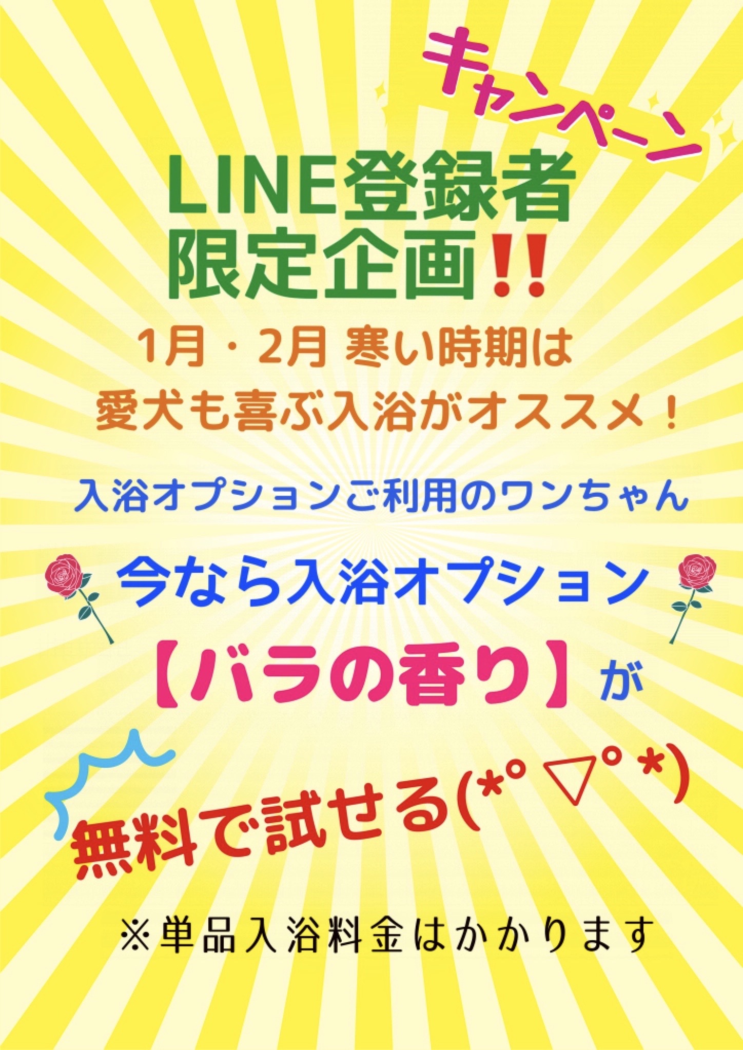 2022年2月6日 / 最終更新日 : 2023年9月27日 dog01freaks お知らせ・キャンペーン情報 LINE登録者限定✨ぽかぽか入浴で抜け毛も取れる⁉限定バラの香りVer 毛もつれ・抜け毛が多い子にオススメ✨ シュワシュワ炭酸泉でぽかぽか(*´ω`*) 寒さも乾燥対策もばっちり❕ ↓のリンクからお友達登録🎵 🌹LINEお友達登録🌹 FacebooktwitterHatenaPocket