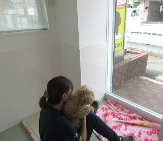 ペット美容前にまずはリラックスする為抱っこでホテルのお部屋からお外を見て黄昏てます(^^♪